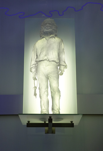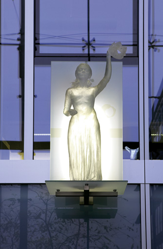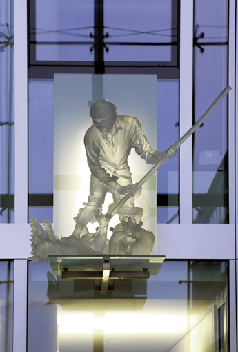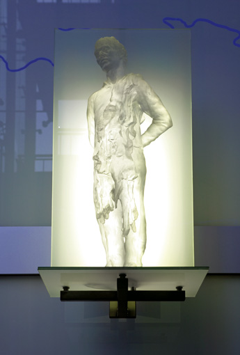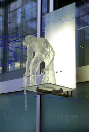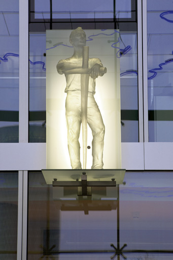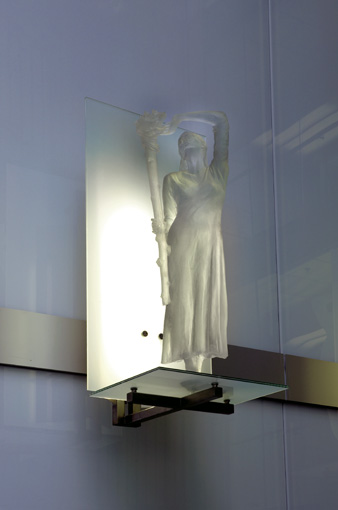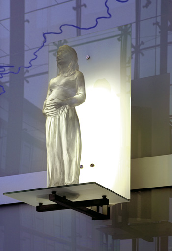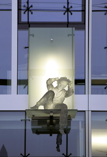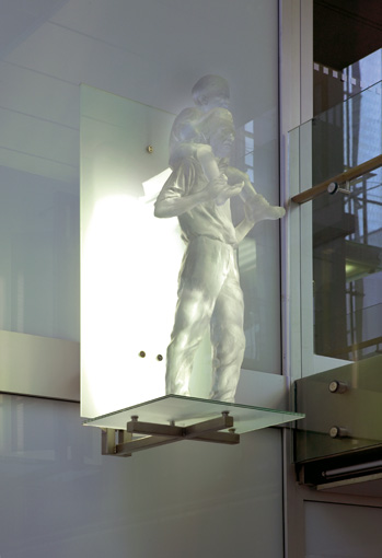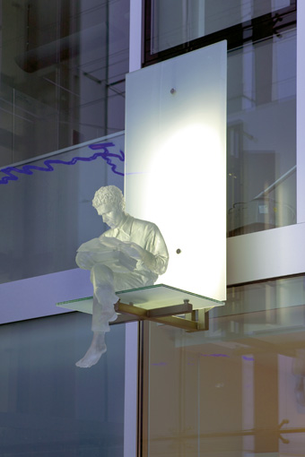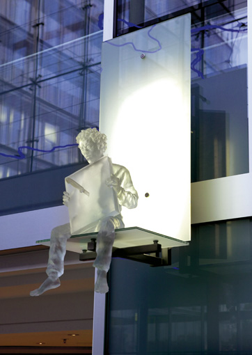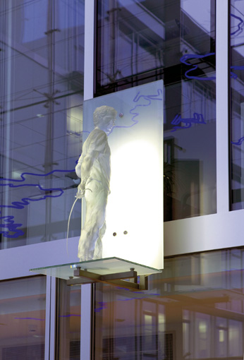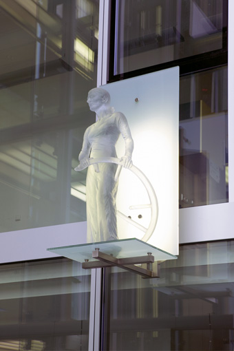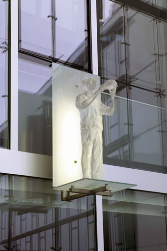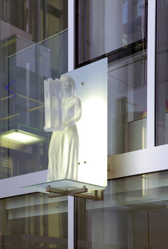 Blick von untenDie Schutzheiligen sind körperlos und durchscheinend, sie scheinen aus Ihrer Hülle zu bestehen. Es sind Erscheinungen, die mir der Glasfassade korrespondieren und zugleich in den freien Raum ragen.